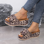 Mode rosett leopardtryck kiltofflor för kvinnor Nya tjocksula högklackade platta skor sommar utomhus fisk mun tofflor