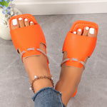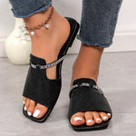 Mode Rhinestone Rem Design Sandaler Sommar Ny fyrkantig tå tofflor med låg klack för kvinnor Slides Casual Beach Shoes